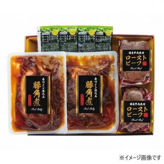 国産牛肉使用ローストビーフ126g×2、赤ワイン仕込み豚角煮220g×2、ローストビーフ・ローストポークソース10g×4